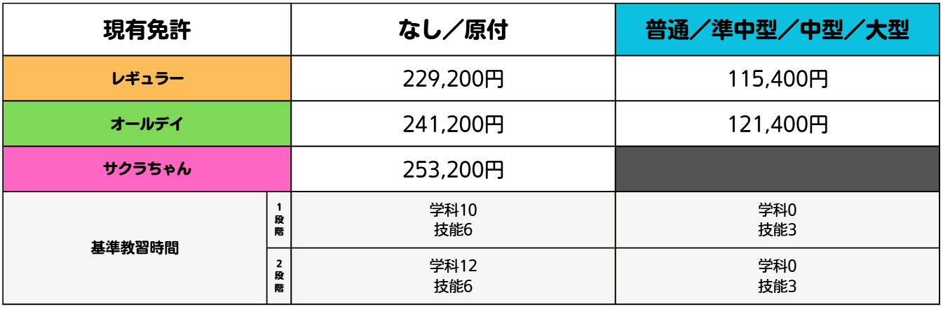 教習料金表【大型特殊用】 2023.07.292026.02.19 2,3月の入校はハイシーズンとなるため、当期間内の入校の”サクラちゃんコース”を選択される場合、教習料金に10,000円(税込)を加算させていただきます。 ---表示金額は全て税込料金となります--- 大型特殊 技能教習追加3時限分まで無料※4時限以降は追加(補習)料金がかかります。 技能教習追加(補習)料金 (1時間当たり) 大型特殊 6,600円