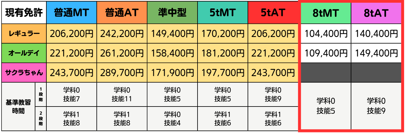 教習料金表【中型車用】 2023.07.282026.02.19 2,3月の入校はハイシーズンとなるため、当期間内の入校の”サクラちゃんコース”を選択される場合、教習料金に10,000円(税込)を加算させていただきます。 ---表示金額は全て税込料金となります--- 中型 仮免許試験の受験手数料および交付手数料2,900円が別途必要になります。 技能教習追加3時限分まで無料 ※4時限以降は追加(補習)料金がかかります。 技能教習追加(補習)料金 (1時間当たり) 中型車 6,600円