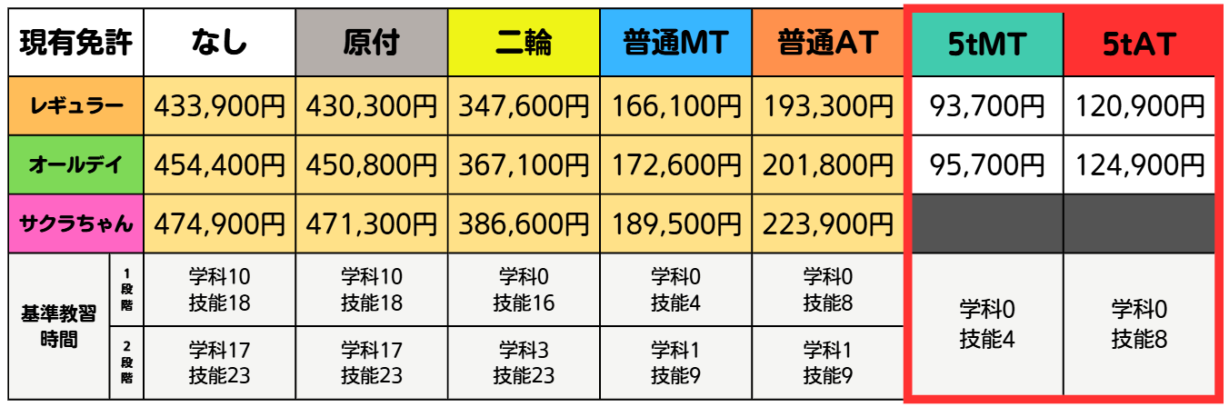 教習料金表【準中型車用】 2023.07.282026.02.19 2,3月の入校はハイシーズンとなるため、当期間内の入校の”サクラちゃんコース”を選択される場合、教習料金に10,000円(税込)を加算させていただきます。 ---表示金額は全て税込料金となります--- 準中型 仮免許試験の受験手数料および交付手数料2,900円が別途必要になります。 技能教習追加3時限分まで無料※4時限以降は追加(補習)料金がかかります。 技能教習追加(補習)料金 (1時間当たり) 準中型車 6,000円